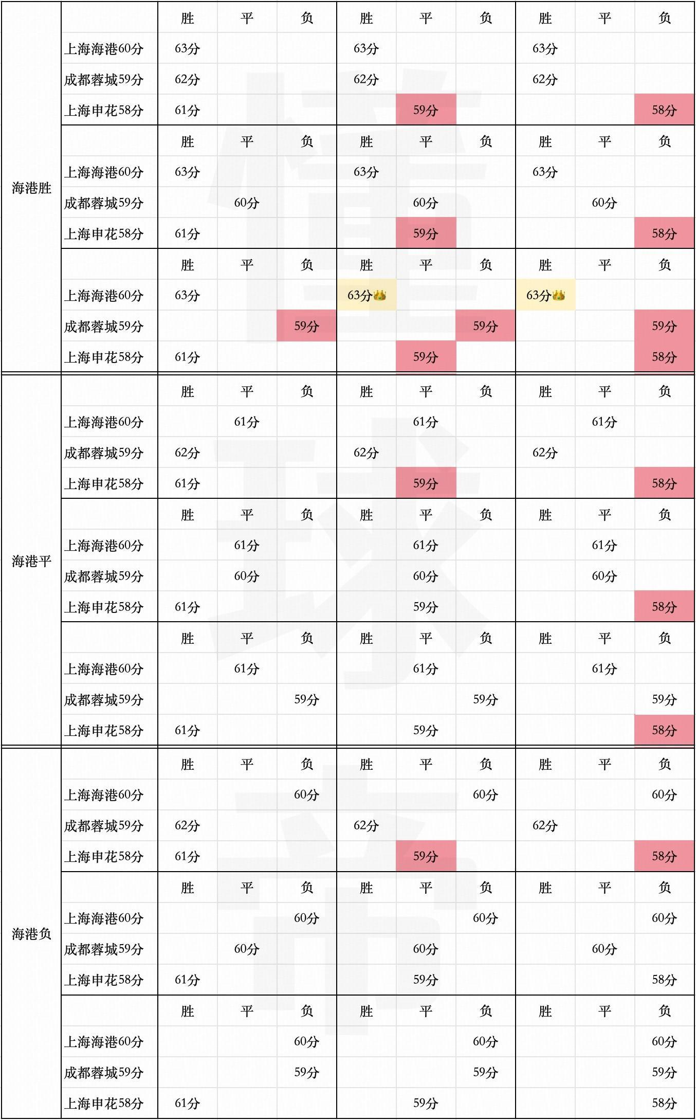今晚的比赛会产生27种赛果组合,有14种可能是三队到末轮继续争冠,有10种可能是海港与蓉城末轮争冠,有1种可能是海港与申花末轮争冠,有2种可能是海港提前夺冠。