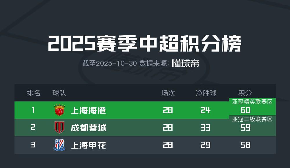10月31日晚,2025赛季中超联赛第29轮将接连进行3场比赛。18点,领头羊上海海港主场迎战浙江队;19点35分,第二名的成都蓉城主场迎战河南队;20点,第三名的上海申花主场迎战深圳新鹏城。